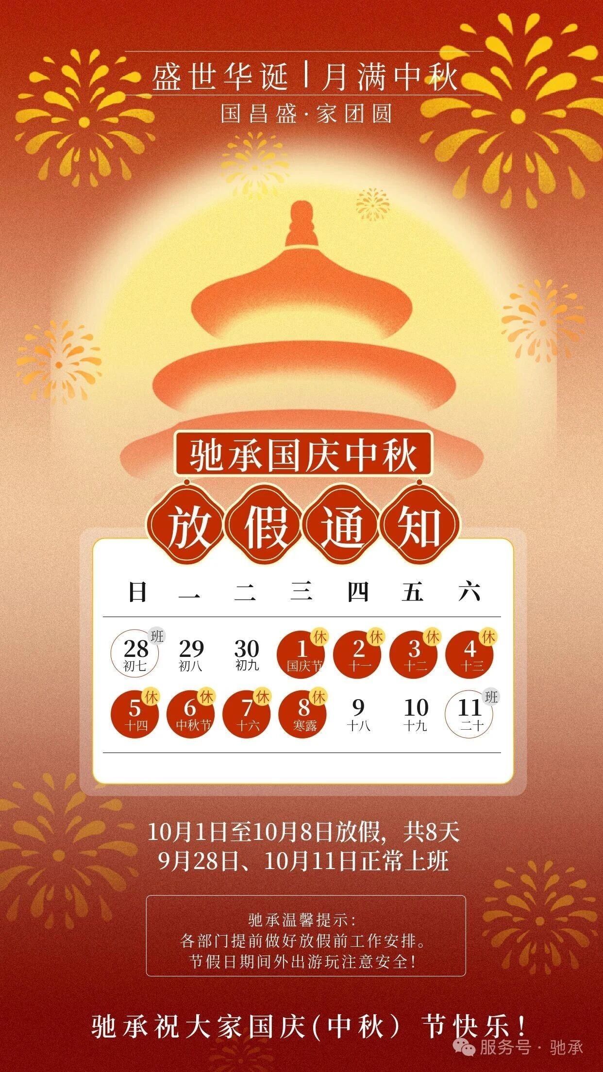 请各岗位在放假前完成手头工作,确保节后业务无缝衔接。 驰承全体伙伴祝愿:客户朋友们及家属中秋团圆、国庆安康,度过一个愉快的假期!!!