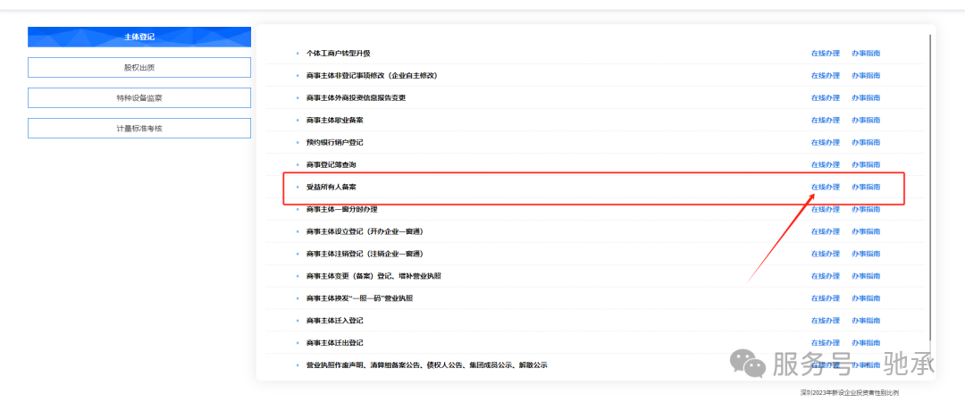 登录深圳市市场监督管理局门户网站,点击“企业开办一窗通”,点击“立即申请设立登记”。完成实名认证登录后,点击“个人中心”,然后点击“我要申请”,最后找到“受益所有人备案”,点击“在线办理”,完成后续备案操作即可。